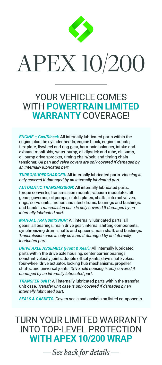 Build long-term customer loyalty and expand your aftermarket profits with our dynamic Apex 10/200 Program that includes a 10/200 Powertrain Limited Warranty with an easy-to-upsell 10/200 VSC Wrap option!